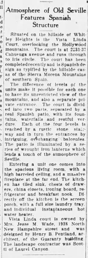 6860-6862 Iris Circle is part of an 8 unit apartment complex which sits on a downslope on Iris Circle and drops down to Cahuenga Boulevard. Originally named Linda Vista Court, the units were built in 1925 by architect Henry B. Pentland, who was also a pilot from World War 1. A few years later Pentland became the trade commissioner for the Department of Commerce and died in 1932 in the Yucatan while traveling home from Panama; he died of typhoid at the age of 38. Ms. Jessie M. Wade hired Pentland to design and build this apartment complex: