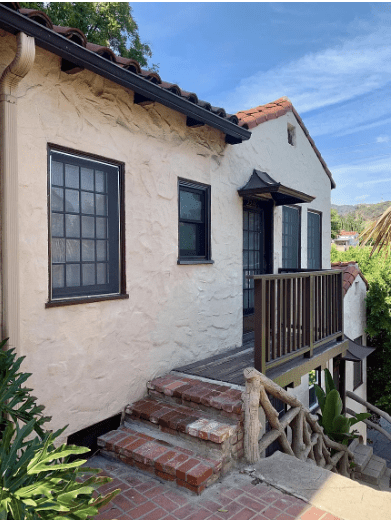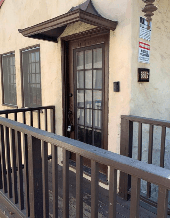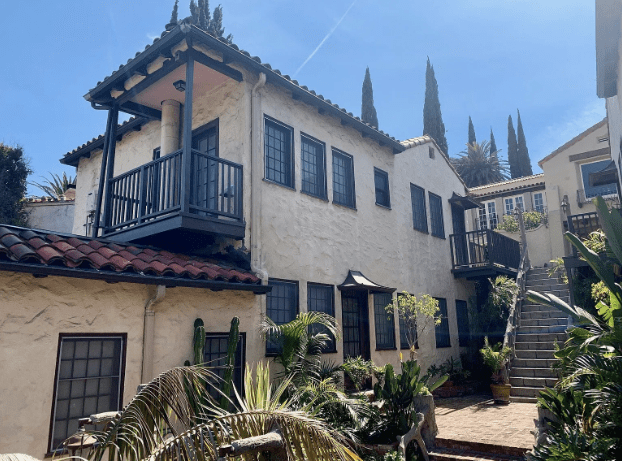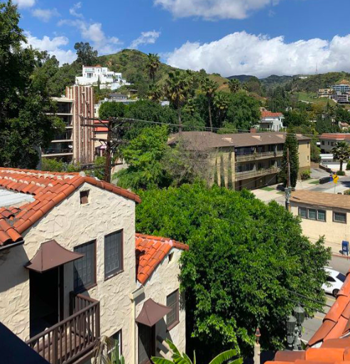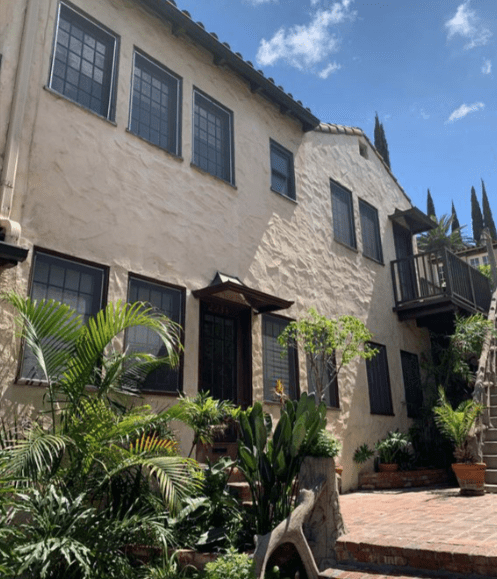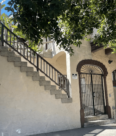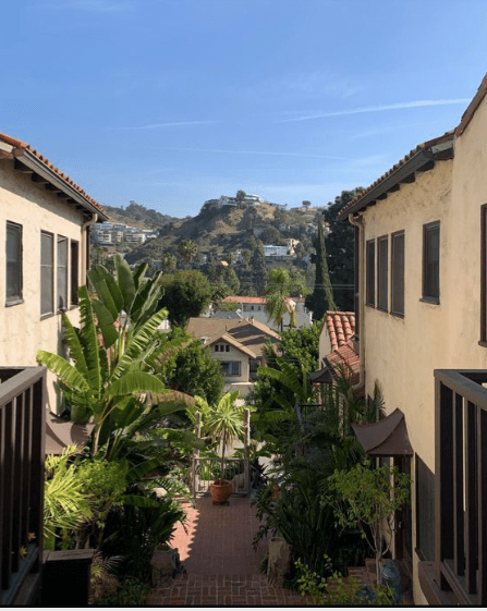 All of the units have a fireplace, kitchen, one bedroom, and one bathroom and are approximately 660 square feet. There are 4 units each in two buildings and each apartment has its own tier which cascades down to Cahuenga Blvd. Below are photographs of the exterior of the complex, now owned by Cahuenga 8 LLC: