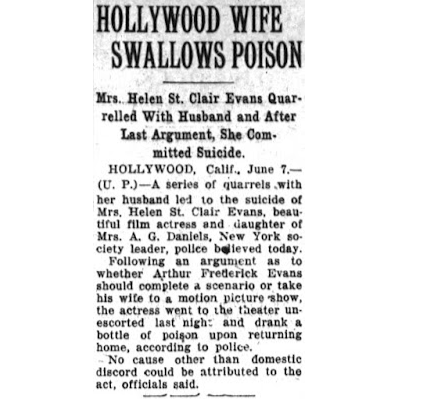 The jury did not find enough evidence to convict the men as the coroner stood by his original autopsy that Helen died of suicide. Arthur did not exactly act innocent. Arthur Evens, who used the name Arthur St. Claire, wrote scenarios in Hollywood from the 1920s until the late 1940s. He recycled some of the events of his wife’s suicide in fictional form in his screenplay, Delinquent Daughters (1944), the story of how a town is shocked when a high school girl commits suicide. Arthur thereupon married Iris Ashton Badger, a 29-year-old actress with whom he had been living for months. At the same time, he was convicted of vagrancy and sentenced to 60 days in jail. Evans married Iris Hanford Badger (who had just divorced William Badger), six months after first wife’s death. Iris Ashton Badger was legally married April 20, 1928 by a judge before he was arraigned before Judge Gray. They thought they were legally married last November and were not due to missing paperwork. This was his third marriage and the judge did not believe he did not know about the paperwork. The two eventually divorced and Arthur married for the fourth time before his death in 1950.