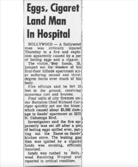 In 1967, 35 year old Bob Sands was residing the same apartment where Helen committed suicide and was boiling eggs on the stove. Sands, who was also smoking a cigarette, was not paying attention to the gas lit stove and the water spilled over the pot putting out the flame. It is odd that it caused a gas leak which caused an explosion due to the lit cigarette: