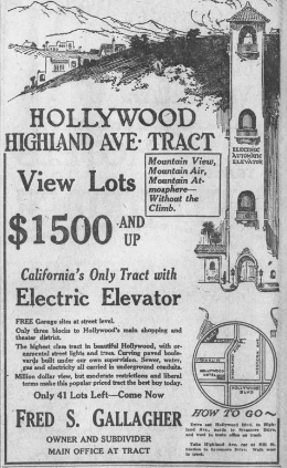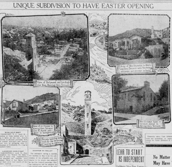 Later, a compound across the street on Highland Avenue went on the market and after looking at an area in Hollywood Hills right above it, I spotted it house on 2039 High Tower Road. Actually the house is a duplex (2037-2039 High Tower Road). There is one unit above the garage and the second unit on the top floor. It was built in 1923 after Fred S. Gallagher bought five acres land and called the area Morning Glory Terraces; Gallagher was also responsible for erecting the High Tower Elevator, which was advertised as “California’s Only Tract with an Electric Elevator”.