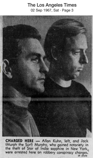 On July 1, 1969, Allan Dale Kuhn, 30, was arrested at 2039 High Tower Road, along with his wife, Susan, 20, and Howard Kessler, 39. Kuhn’s claim to fame was in 1964, when he and another Miami scuba diver named Jack “Murph the Surf” broke into the New York Museum of Natural History and stole the Star of India sapphire. Both served only two years in prison and when both was released, continued their lives of crime. Kuhn was arrested several times in Los Angeles for robberies in several exclusive homes in Beverly Hills. Murph the Surf was arrested in Miami in 1968 for the murders of two Hollywood, California secretaries who stole $500,000 worth of securities bonds and gave them to Murphy. Murphy had not paid them their share and they threatened to squeal so he allegedly killed them and then drove the bodies to Hollywood, Florida, where he tied the bodies to concrete blocks and put them in a canal. Murphy was caught after jumping through a glass door in Miami after a shoot out when he was robbing the place. Kuhn met the 20 year old waitress at a Van Nuys bar and she divorced him a year later.