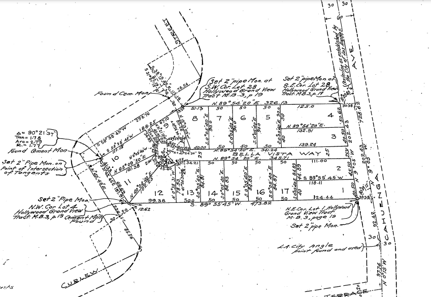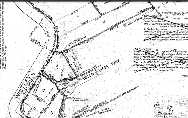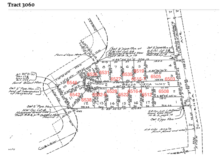 Below is the original 3060 tract and the 17 lots on Bella Vista Way. The first four lots contained Bungalow Courts which were popular in the early 1900s in Los Angeles where tiny houses could form around a courtyard and save space. Lot 10, originally listed as 6546 Bella Vista Way, was built in 1918. When the owner moved the garage from lot 11, it was now accessible on Whitley Avenue and changed to 2040 Whitley Avenue.