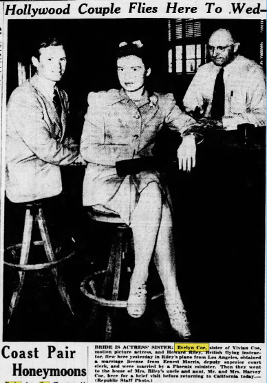 On October 25, 1941, Evelyn flew with her fiance in his airplane to Arizona and eloped to British flying instructor Howard Riley, 32. The left the next day to return to Hollywood. Evelyn moved out of the Bella Vista home after she got married. Maude moved out of the Bella Vista home and moved in with her oldest daughter’s family in Van Nuys. Howard and Evelyn had two daughters but divorced by 1950. Both were living in Monrovia but in separate households, Evelyn living with her two daughters, ages 4 and 6. Evelyn eventually remarried in died in Orange County in 1989