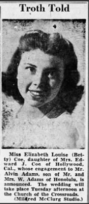 Elizabeth L. (Betty) Coe was born in 1918 in Los Angeles. Betty also became involved in the entertainment industry as a child and was seen in the “Kiddie Review” staged by the Girard Theatrical Dance Studio with her younger sister, Vivian, in 1931. Betty graduated from Hollywood High School and then attended Los Angeles City College. She then moved to Honolulu, Hawaii and worked at Pearl Harbor. She met and married war engineer Alvin “Doc” Adams and they married in Hawaii. They remained in Hawaii where they had three children.