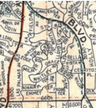 Only five of the lots remain from the original 3060 tract before the street was literally cut in half. Like many of the Whitley Heights residences and areas, Bella Vista Way has a unique history of characters and events. The above street sign was put in after a side road off of Cerritos Place had to be created in order for the residents of Bella Vista Way to be able to exit the area. Bella Vista means “Fine View” or “Beautiful View” in Spanish. Before Bella Vista Way, there was a small town called Bella Vista (near Redding) and the Hotel Bella Vista in San Francisco in the early 1900s. Then came Bella Vista Terrace in Sierra Madre where Irving Gill built the iconic bungalow courtyard in 1912.