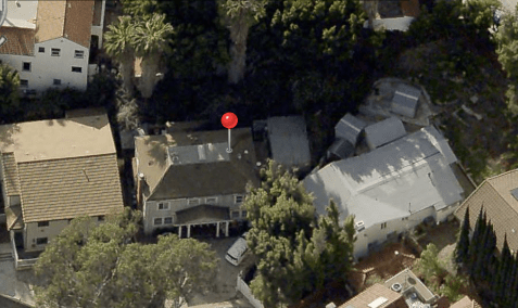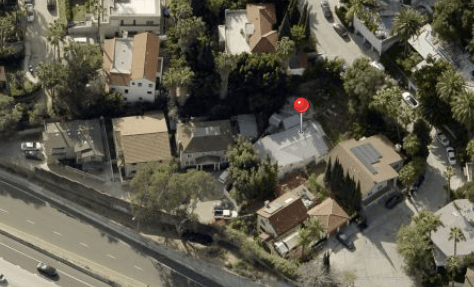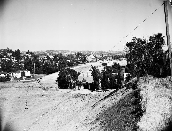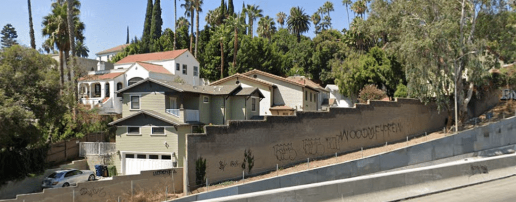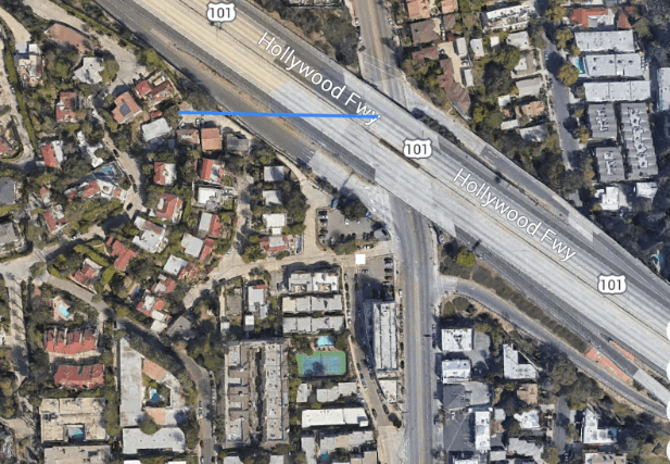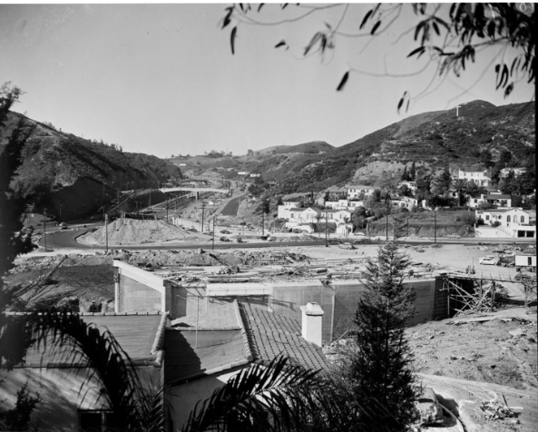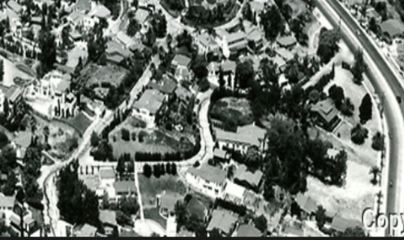 By the early 1950’s, the state of California seized the land to build the Hollywood Freeway. Below is the area that used to be Bella Vista Way. The garage of 2040 Whitley Avenue can be seen in the center.