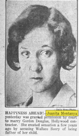 When Montanya was placed on probation the second time for taking the Kelly’s items, her public defender felt sorry for her and became her “guardian”. She moved into J.H. Davis’ home for several months. She became unmanageable so Davis surrendered his guardianship and she was brought back in front of the judge in April of 1929. In July of 1929, she was arrested for another burglary charge in Riverside and pled guilty. She had moved to Riverside and moved in with a pastor and his family, who also felt sorry for her. She ended up stealing from the family. In November of 1930, Montanya married a 43 year old contractor from Hollywood. At the time, Gordon Douglas was a widow and had two sons: ages 16 and 18; he claimed he knew Montanya for over a year and a half. Her child had been taken from her care and now married, she wanted to get custody back of the 3 year old child that she still claimed was the child of Wallace Beery.