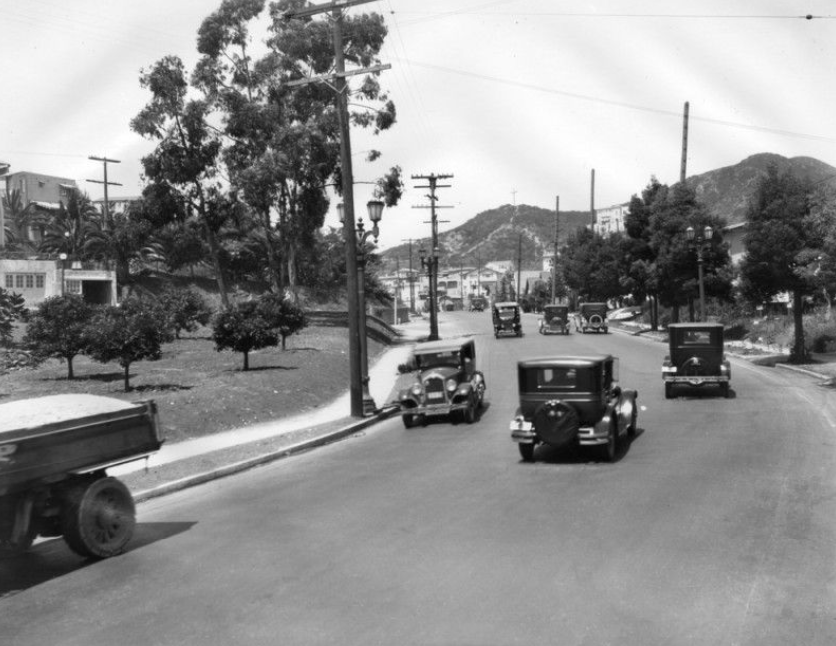 Bella Vista Way used to be a foothill street with a cul-de-sac, lined with one- and two-story bungalow houses that backed up to Whitley Avenue (formerly Curlew Street). Bella Vista Way actually ran parallel to Cerritos Place and the only entrance was on Cahuenga Blvd before it was demolished to make way for the 101 Freeway. Below is Cahuenga Blvd. in the 1937-Whitley Avenue can be seen ahead to the left. Bella Vista Way would be south of Whitley Avenue on the left side.