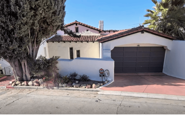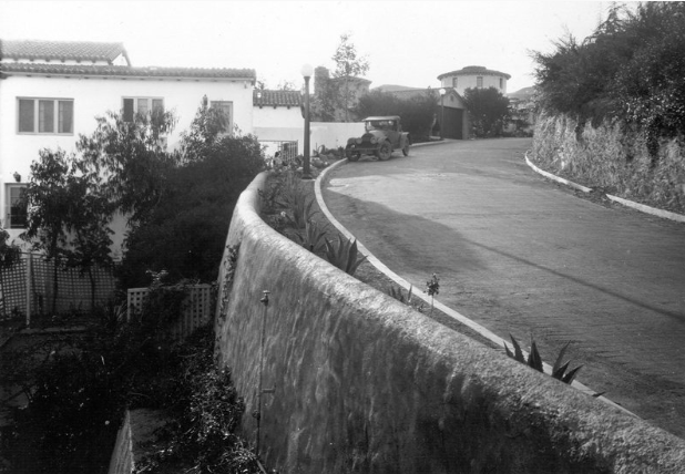 Calliga became romantically involved with a socialite from Pasadena named Mabel Gould as early as 1942 and they married in 1944. Calliga was 47 at the time and Gould lied about her age, stating she was 58, when in fact, she was really 66 years old. However, the two remained married until her death in 1959. Gould once owned an interior design business with her brother and was involved with the Rose Bowl Parade in her younger years. Below, 6654 Whitley Terrace, with a car in front of the home, soon after the retaining wall was built in Whitley Heights in the 1930s.