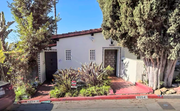 6654 Whitley Terrace was built in 1926 by architect D. Kramer for Mr. and Mrs. Roy Clark, a general contractor. A single family 11 room house was built with four levels and two fireplaces. There is a total of 4,058 square feet with 7 bedrooms and 7 bathrooms. An apartment with a separate entrance, listed as 6654 1/2 Whitley Terrace, continues to be rented. Below, the entrance to 6654 1/2 Whitley Terrace is on the left side. For a period of time, the apartment did not have a kitchen; it would be rented as a one bedroom apartment with a den.