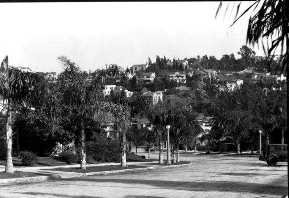 Below is a view of Fairfield Avenue from Cahuenga Boulevard which would lead up to Whitley Heights. Houses on Fairfield Avenue, Wedgewood Place and Whitley Terrace could be seen from the distance. 2200 Fairfield Avenue was located on the left near the end of the row of palm trees.
