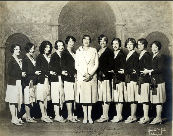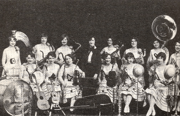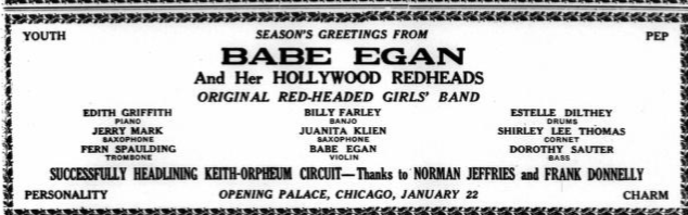 George and Estelle Hambaugh resided in the home in 1936 after they got married. Estelle Dilthey Hambaugh was the drummer of an all-girls band called Babe Egan and Her Hollywood Redheads in the 1920s. Babe Egan (1897-1966) was a violinist and bandleader that was very successful from 1924 until 1933. They toured those years as a vaudeville act throughout the United States, Canada, and in Europe. Estelle was born in 1908 in Fresno County and her father formed the Musical Dilthey Family Band which she was playing the drums. Her father quit working for the Southern Pacific Railroad and moved the family to Los Angeles in 1920 hoping to make it big in the music industry. However, her father was forced to get a second job as the band struggled getting gigs, playing mostly for fraternal organizations. In the 1920s, female drummers were not recognized, but working for Egan, Estelle’s name appeared in the lineup. Below, Estelle is forth from the left and behind the drums in the later photo.