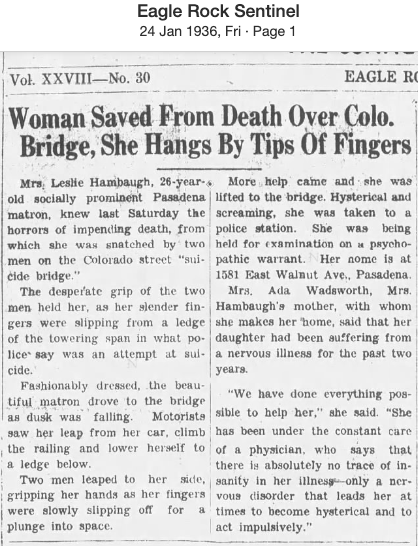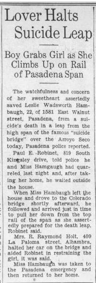 After they divorced, Leslie was having difficulty coping. In April of 1924, she attempted suicide by jumping off of the Arroyo Seco Bridge. Leslie was dating Paul Robinet and he told police that they had an argument and he decided to park outside of her house after he dropped her off. He followed her to the bridge and saved her from the fall. Leslie had moved back in with her parents after her divorce.