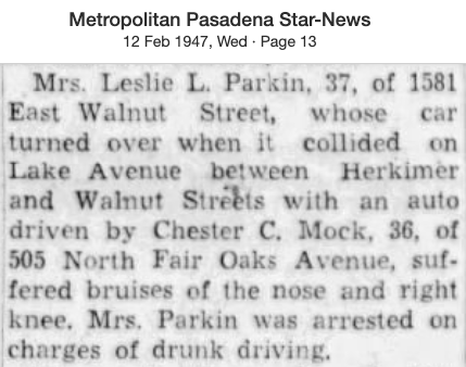 George and Estelle had a daughter named Carol Anne after moving to Sierra Madre in 1937. By 1940, they were renting a house in Beverly Hills and all three children were living with them. Leslie married again to Victor Parkin in Oregon in 1931 and they had a son named Richard two years later but the marriage did not last. Leslie moved back in with her mother in Pasadena and by 1950, her 17 year old son, George, was living with them. Richard must have been living with his father. Leslie continued to have emotional issues and had started drinking as she was arrested for drunk driving in 1947.
