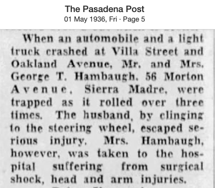 George and his new wife, Estelle rented 6758 Milner Road in 1936 as they were building a home near George’s parents in Sierra Madre. A few months later, George and his new wife, Estelle were in a terrible car accident: