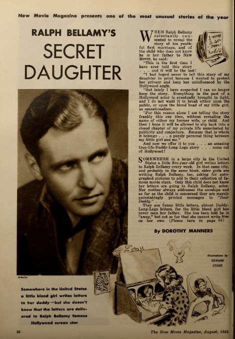 Bellamy continued to be an absent parent to his daughter and The New Movie Magazine was not letting him off the hook. In 1934, they wrote a hit piece how he has not relationship with his daughter and that she does not even know that her father is a famous actor. However, they did mention that Bellamy would send her letters at times.