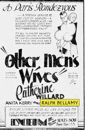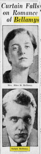 In June of 1930, it was announced he was co-starring in the play, “Other Men’s Wives” with actress Catherine Willard. Ironically, she was going to be the next Ralph Bellamy. Bellamy and Willard went on to co-star in the play “Suppressed Desires”. The irony of the titles of the plays! By the end of 1930, Bellamy’s acting career exploded as he signed a contract with United Artists and moved to Hollywood. However, MGM borrowed him for a role in The Secret Six starring Wallace Beery. With the move to Hollywood, Bellamy quickly forgot about his wife and daughter. Delbridge got tired of her husband’s absence and filed for divorce in February of 1931 citing cruelty and non-support and went through a very public divorce.