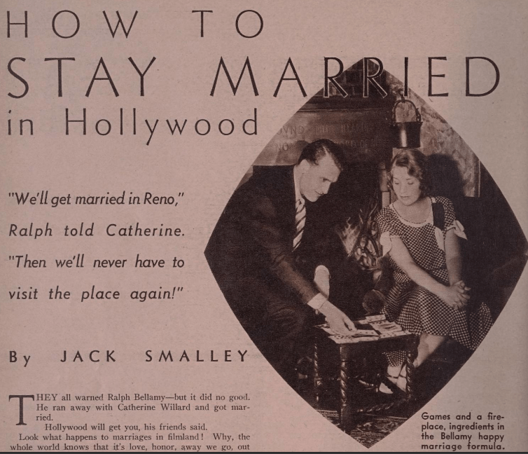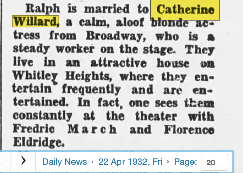 In July of 1931, Bellamy and Willard eloped in Las Vegas Bellamy’s divorce was finalized the month before and Willard’s divorce had recently been finalized from actor William E. Barry. The Bellamy’s moved to 6667 Emmet Terrace prior to April of 1932. Willard continued to get Broadway jobs in New York, but she did not like leaving Bellamy alone for long. (Perhaps she suspected he would hook up with another leading lady).
