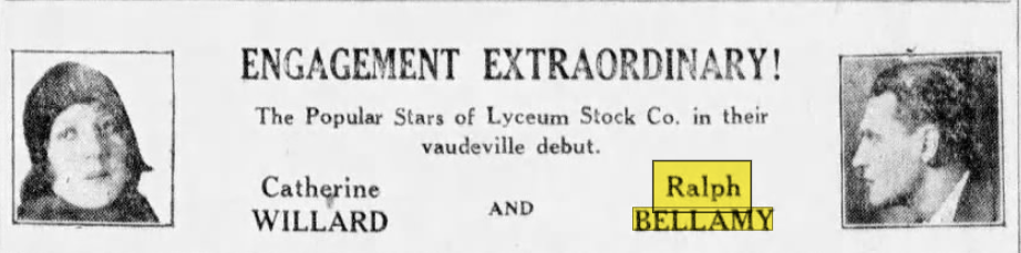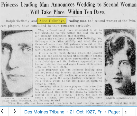Interestingly, Bellamy married four times. First to Alice Delbridge between 1927 and 1930. Delbridge was a stage actress and they met when she was part of the Ralph Bellamy Company and literally had a “whirlwind romance”. They ran around Iowa trying to obtain a marriage license (in a few towns unsuccessfully) and causing their show to be shut down for a few days. Less than a year after they were married, they gave birth to a girl in May of 1929. As Delbridge “retired” from acting to take care of the baby, Bellamy was traveling all over to perform on the stage.