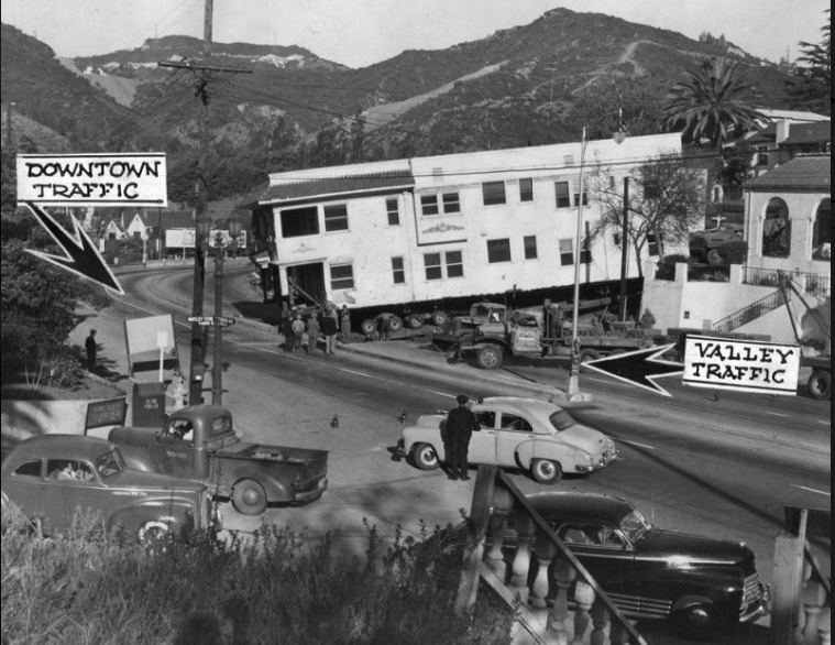 Unfortunately, 2116 Fairfield Avenue would “haunt” Darr for the next few years. The following June of 1949, Darr received a printed notice from the Los Angeles tax collector that he was delinquent on 2116 Fairfield Avenue of the amount of $130.81, the house he no longer owned. The kicker was the notice stated that if he did not pay the delinquent taxes and other penalties before June 30, 1949, then the house would be sold to the state. Darr was livid-he was forcefully evicted from his home and had to pay the taxes? Then in 1950, he actually saw 2116 Fairfield Avenue being moved. He was driving home shortly after midnight when traffic on Cahuenga Boulevard was slow and merging into one lane. That is when he saw a large house being moved and he noticed it was his old house. Reminds me of this photo of a Spanish style house being moved across the boulevard at Whitley Terrace in Hollywood becoming a massive blockade. As a result, thousands of cars had to be re-routed, as indicated by the two signs which are directing the northern and southern flows of traffic. Photo dated: March 13, 1951.