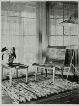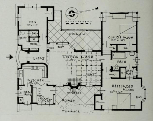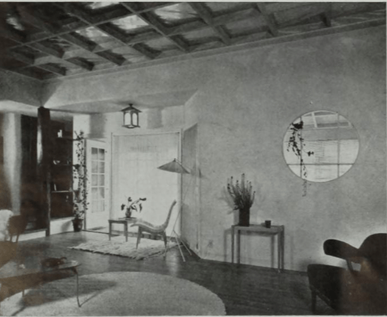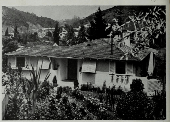 The one-story home consisted of a central living room with two porches on two sides, a kitchen with a breakfast nook, a den with adjoining bathroom, and in the back, two bedrooms and one bathroom. The home appeared in the September 1941 issue of California Arts & Architecture and was dubbed “Bermuda House”. Ralph A. Vaughn, one of the first well known African-American architects of the area designed the home, Greta Magnusson-Grossman decorated the interiors and Dunckley Murray was responsible for the exterior landscaping. According to the California Arts & Architecture article, the step-down living room had a ceiling of silver and blue hues with a sun porch in yellow and rattan along the west wall, featuring a 12 inch round post with flower shelves. The exterior trim, including the shutters are in off-white and east porch contains a barbeque area. There was a separate detached garage built on the property.