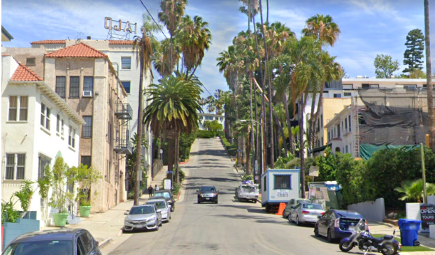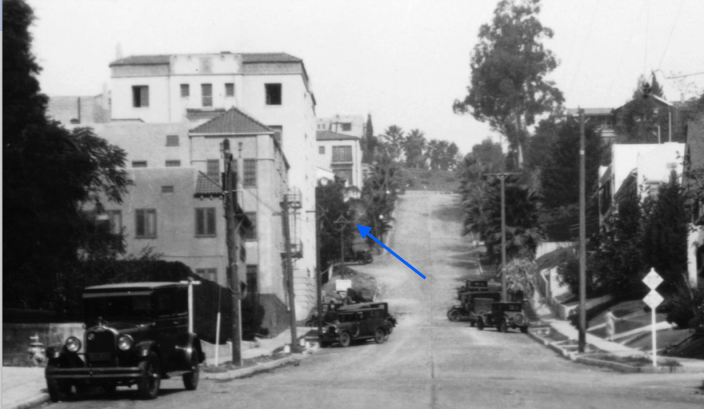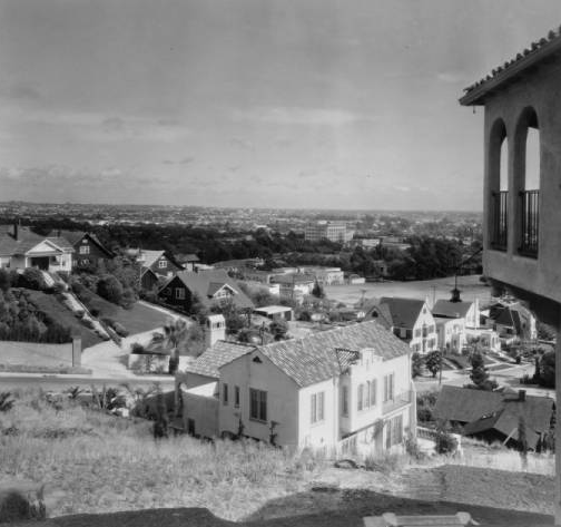 Below is the rear of 6603 Emmet Terrace in the early 1920s (the balcony of 6620 Whitley Terrace is seen to the right). All of the homes seen on the other side of Whitley Avenue below 6603 Emmet Terrace have been demolished for apartment buildings. 1944 Whitley Avenue (across from 6603 Emmet Terrace) and 1936 Whitley Avenue (below 1944 Whitley Avenue), were both demolished in 1964. The property below 6603 Emmet Terrace was torn down in 1928 for the construction of the Ojai Apartments.