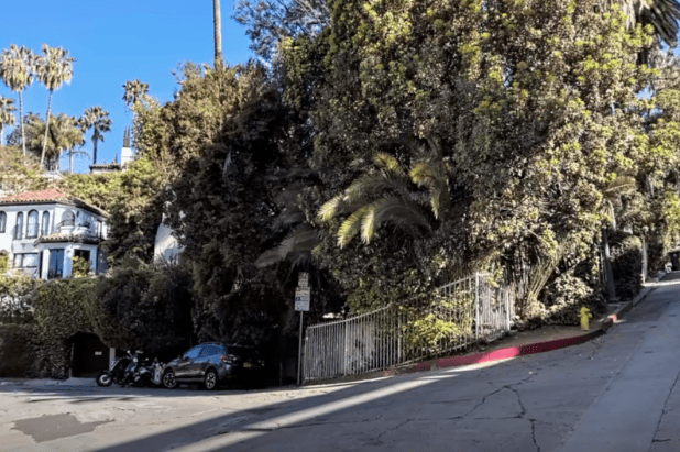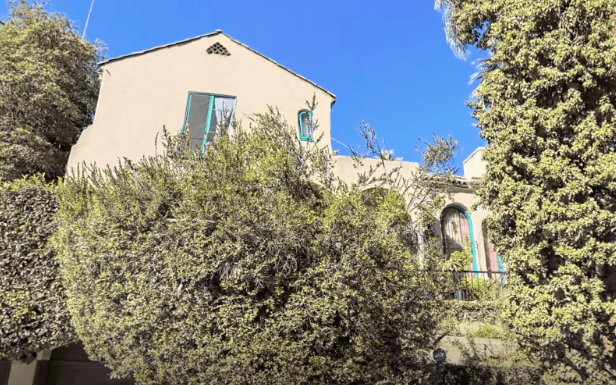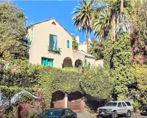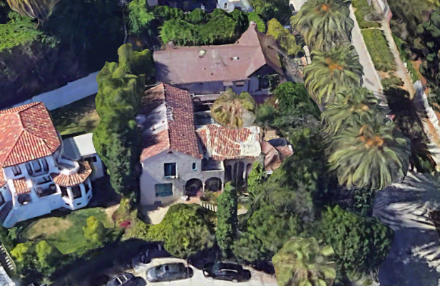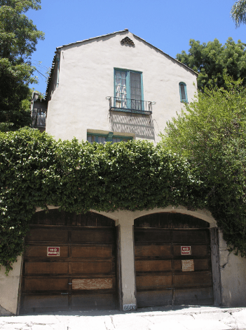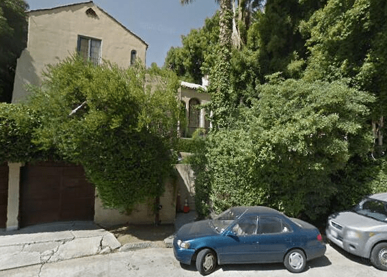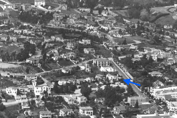 Yolanda did not do any other films after that. Clarence, however, worked as a studio employee for Warner Brothers. In 1950, Clarence died at the age of 28. Yolanda married an electrician and lived a very comfortable life in the valley. As for 6603 Emmet Terrace, the Van Patten’s took out a loan in 1940 to replaster and paint the exteriors, cement the walkway, repair the tile in the bathroom, repair the roof, and replace the cement floor in the sunroom with wood. Not much more had been done with the property and probably needs some updating. The tall columns outside the entry can be seen in the aerial view below. The house is surrounded by overgrown trees.