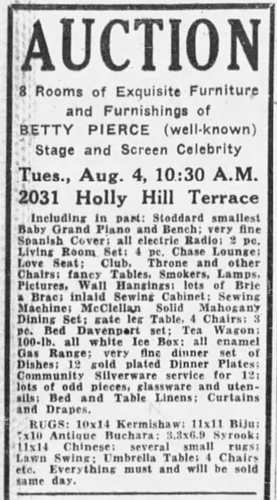 Daniels only stayed in this Whitley Heights home until early August of 1931 and she auctioned off all of her belongings (probably to return to New York):