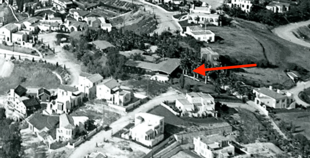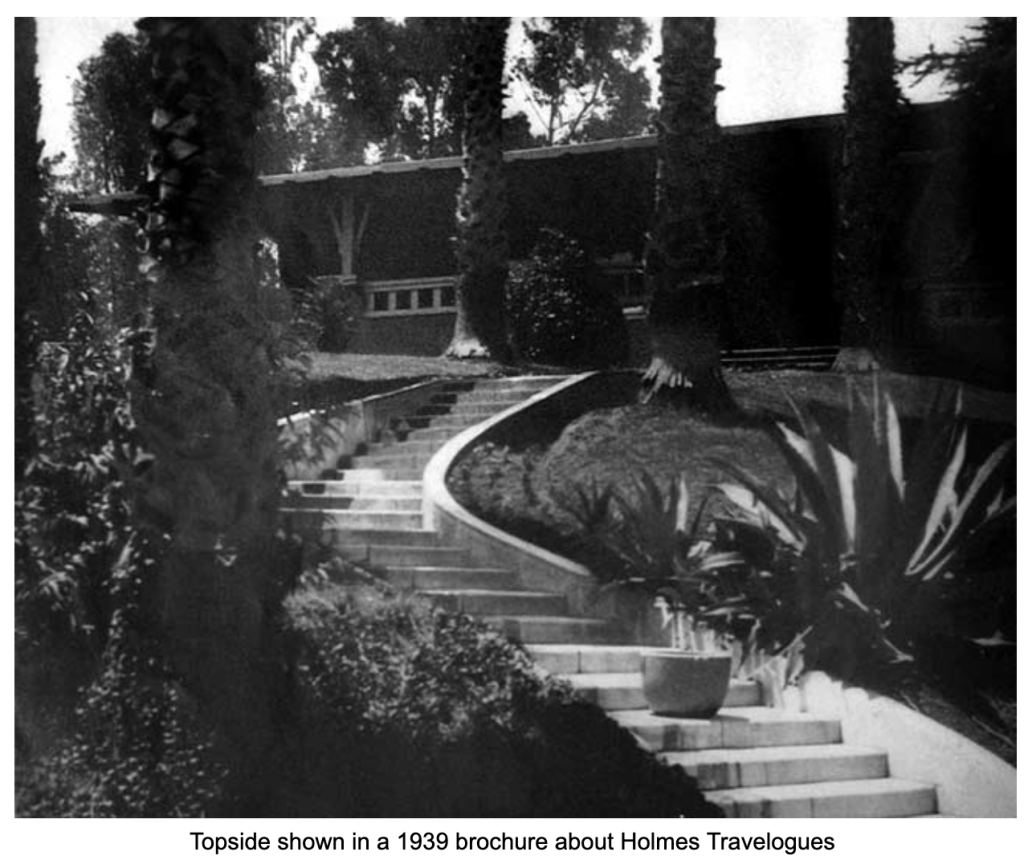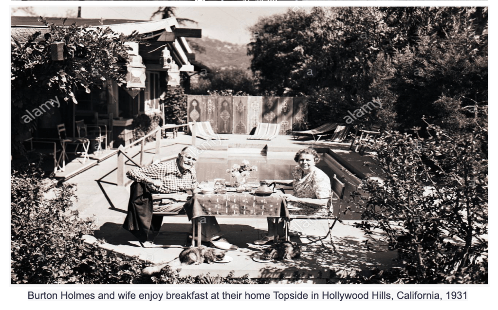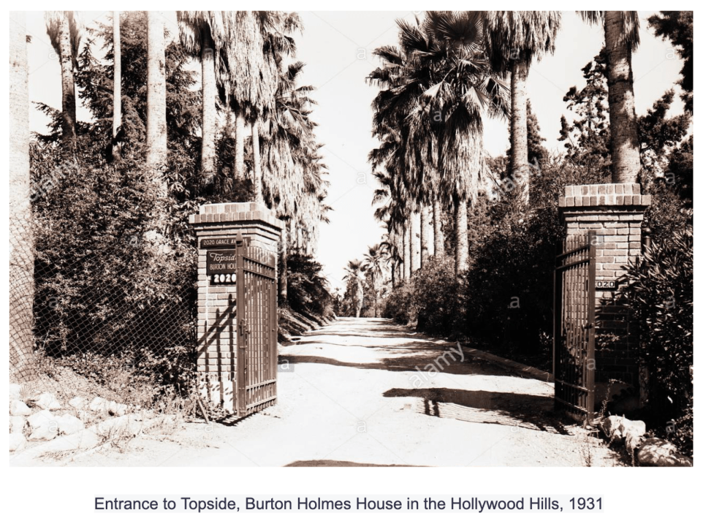 In 1931 famed traveler, photographer, and lecturer Burton Holmes bought the home which he named, “Topside”. Holmes actually photographed Jean Harlow and Samuel Kayzer while she was taking a voice interpretation lesson at his residence in Whitley Heights in 1931. He rented out the house as he was taking a trip around the world. It was advertised in the Los Angeles Times in November of 1931 as “Topside the beautiful home of Burton Holmes, acre of grounds, unsurpassed view, top of Whitley Heights, 4 master bedrooms, 3 baths, servants rooms & bath.” Rent would be $350 per month.