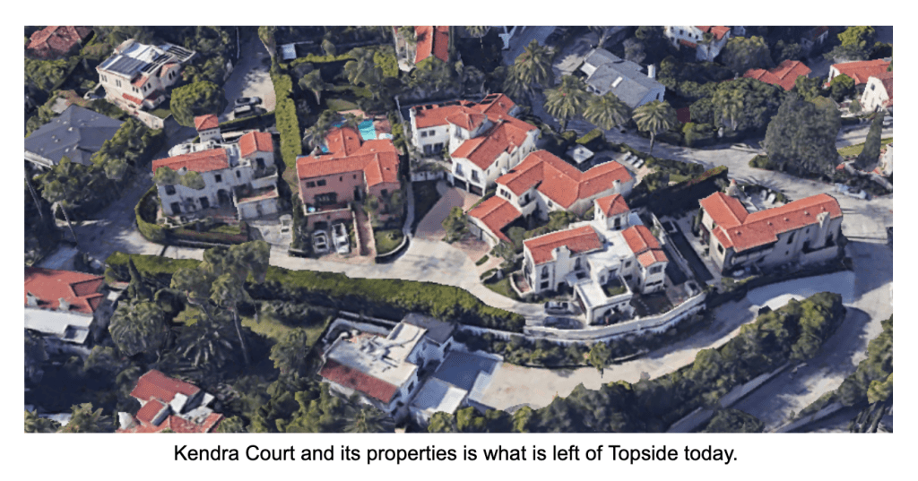 After Burton’s death in 1958, the property remained with his company, Burton Holmes Investments. BHI made a small amount of money renting Topside to individuals but by 1971, the company was barely staying afloat. To keep the company going, they sold Topside in the early 1970’s to Shaun Dale, a Japanese businessman, who was arranging an exhibition of Holmes’ work in Japan. Dale in turn sold the property to a group of developers in the late 1970’s; they tore the house down about 1979, but did not put anything in its place until the 1990’s when the Kendra Court development went in.