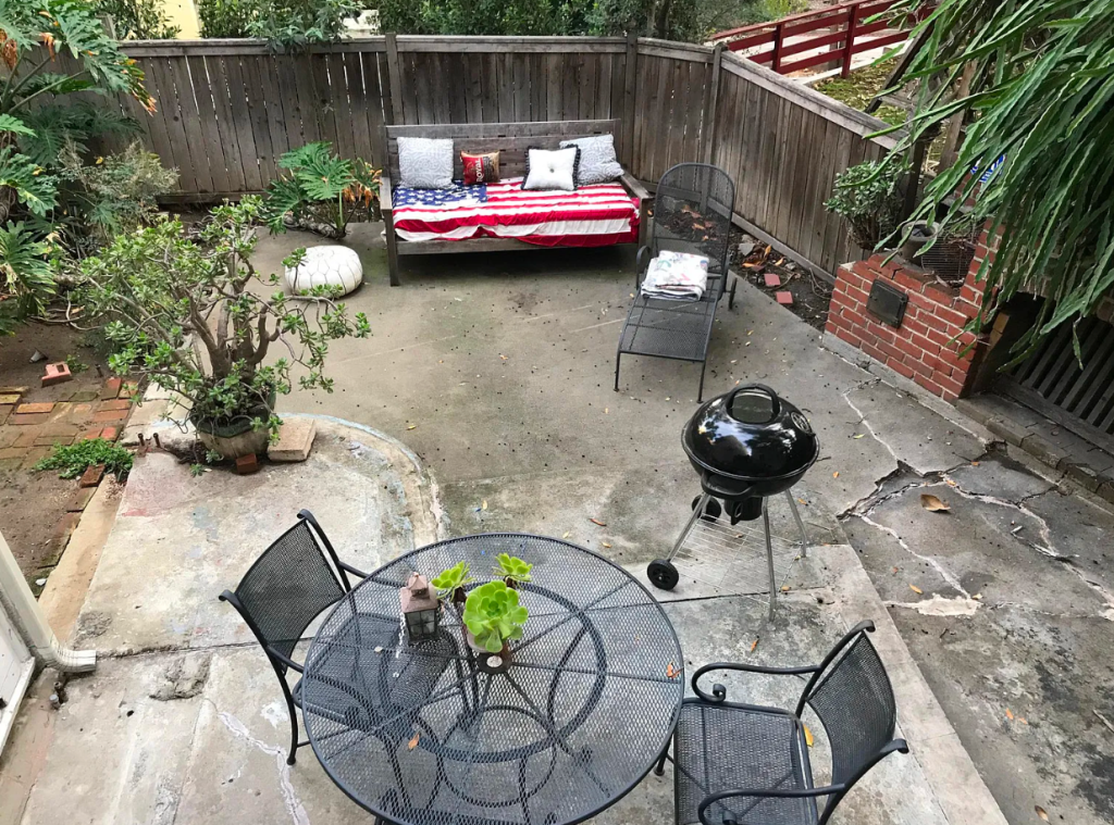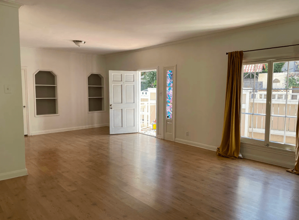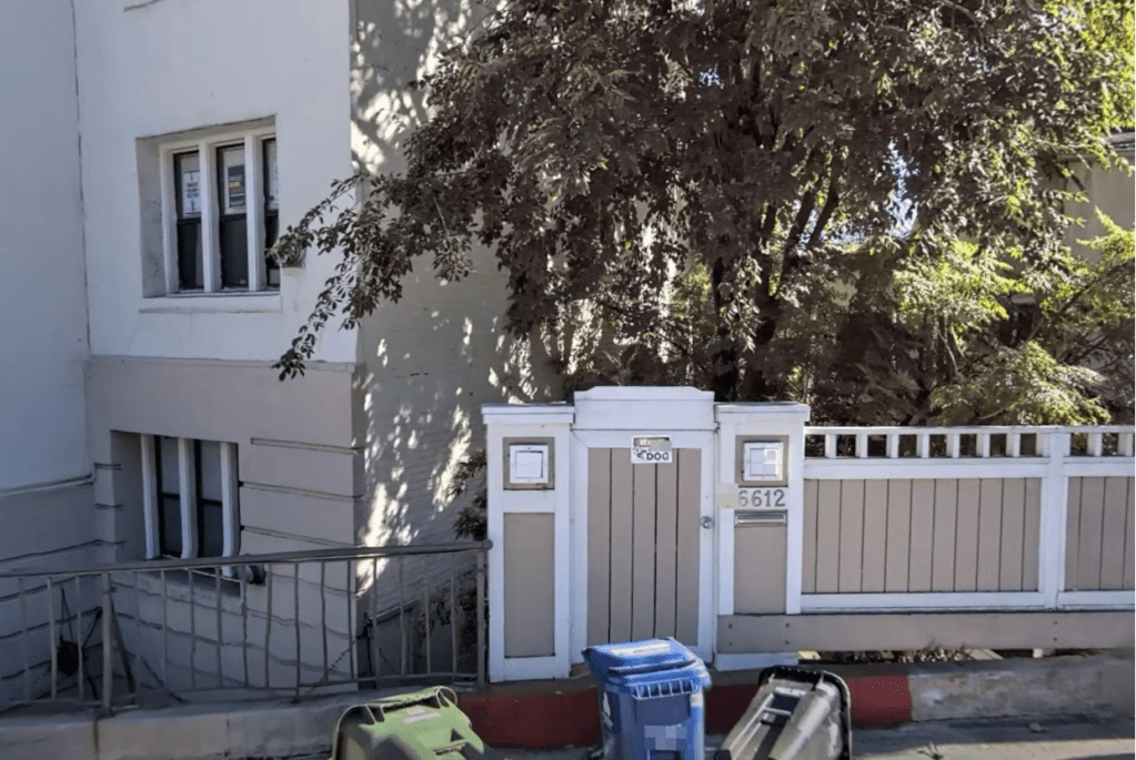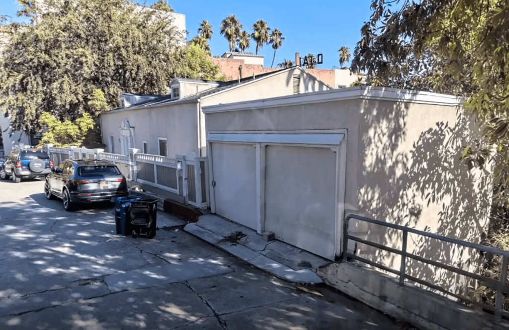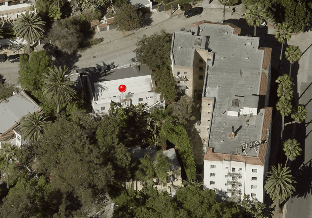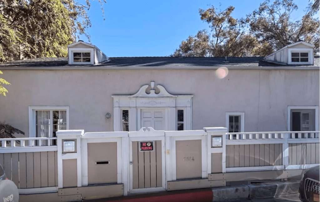 The duplex sits on Emmet Terrace near Whitley Avenue next to the Ojai Apartments (the sign of the Ojai can be seen in the photo above just above this home). This residence consists of a Georgian entrance with two, 2 bedroom, 2 bathroom units. The property was repainted in 1953 and repaired due to termite damage the following year. A new roof was put on in the 1990s along with foundation repair. The home has remained intact other than bathroom and kitchen remodeling.