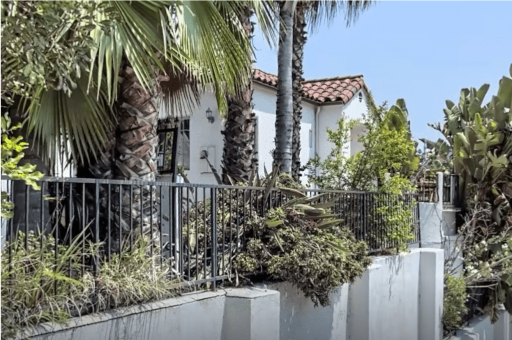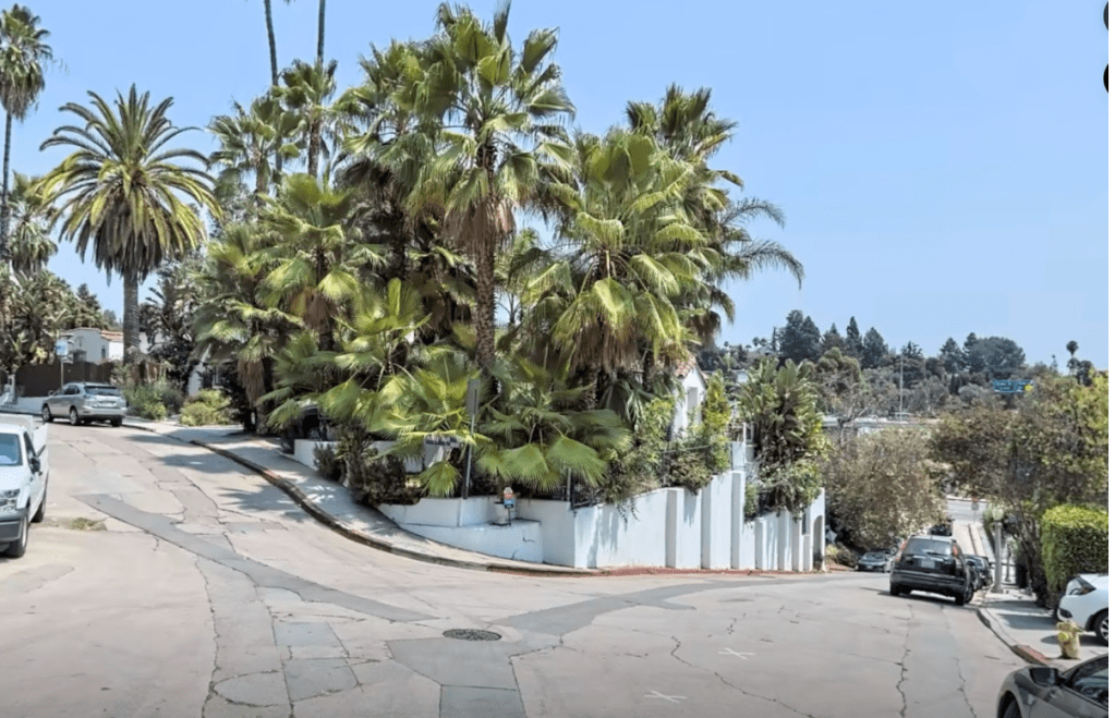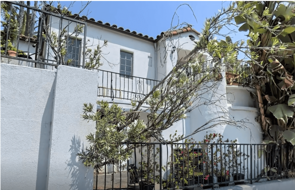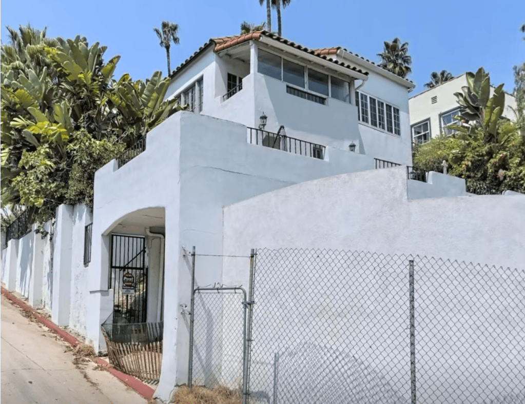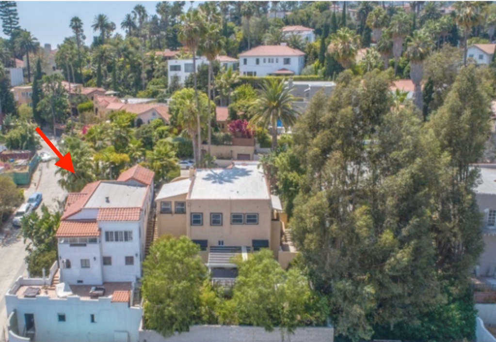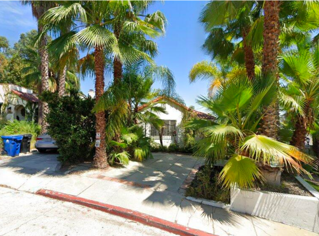 2022 Holly Hill Drive was built in 1925 by famed architect and art director Carl Jules Weyl (The Adventures of Robin Hood, Casablanca) who also built one of the Brown Derbys and several other homes in Whitley Heights. Above is a photograph of 2022 Holly Hill Terrace prior to re-landscaping the front of the home and removing the exterior front steps. As seen below, there is minimal front landscaping and the house is partially out of view by trees.