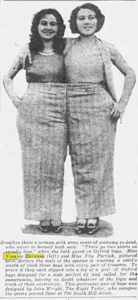 Nina de Ravenne (1909-1997) was the only female sibling in the family and changed her stage name to Nina Borget. Borget was credited for 59 character roles between 1933 to 1963. Borget worked in films starring; Spencer Tracy, Cary Grant, Joan Crawford, Fred MacMurray, Greer Garson, Constance Bennett, Alan Ladd, Veronica Lake, Bob Hope, Clark Gable, Lana Turner, Errol Flynn, Doris Day, Joan Collins, Gregory Peck, Lauren Bacall, and Rosaland Russell. Her most notable films included: Little Women (1933), Love Letters (1945), To Catch a Thief (1955), Fanny Face (1957), and The Haunted Palace (1963). In 1948, Borget was hired by Paramount Studios as a French teacher and one of her students was actor Bob Hope. Nina died in 1997 with the following obituary:
