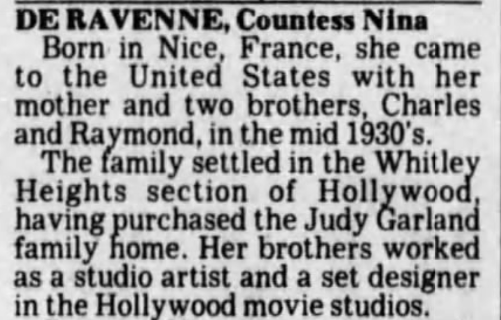 Charlene de Ravenne was born in Nice, France and married at the age of 15. Four children were born in Nice to the de Ravenne’s: Raymond, Francois, Nina, and Charles. After her husband died, the once Monacan opera singer moved her family to Hollywood circa 1922. The de Ravenne’s were a “tight-knit” family so much that they would remain together in Los Angeles until each of their deaths. Only Francois married twice, each resulting in divorce; no other sibling married nor no offspring were produced to continue the de Ravenne family name. The family moved around renting homes in the Los Angeles area before purchasing the Holly Hill Terrace home circa 1940. This house would remain in the de Ravenne family until Nina’s death in 1997. All of the siblings became involved with the movie industry and essentially became movie extras.