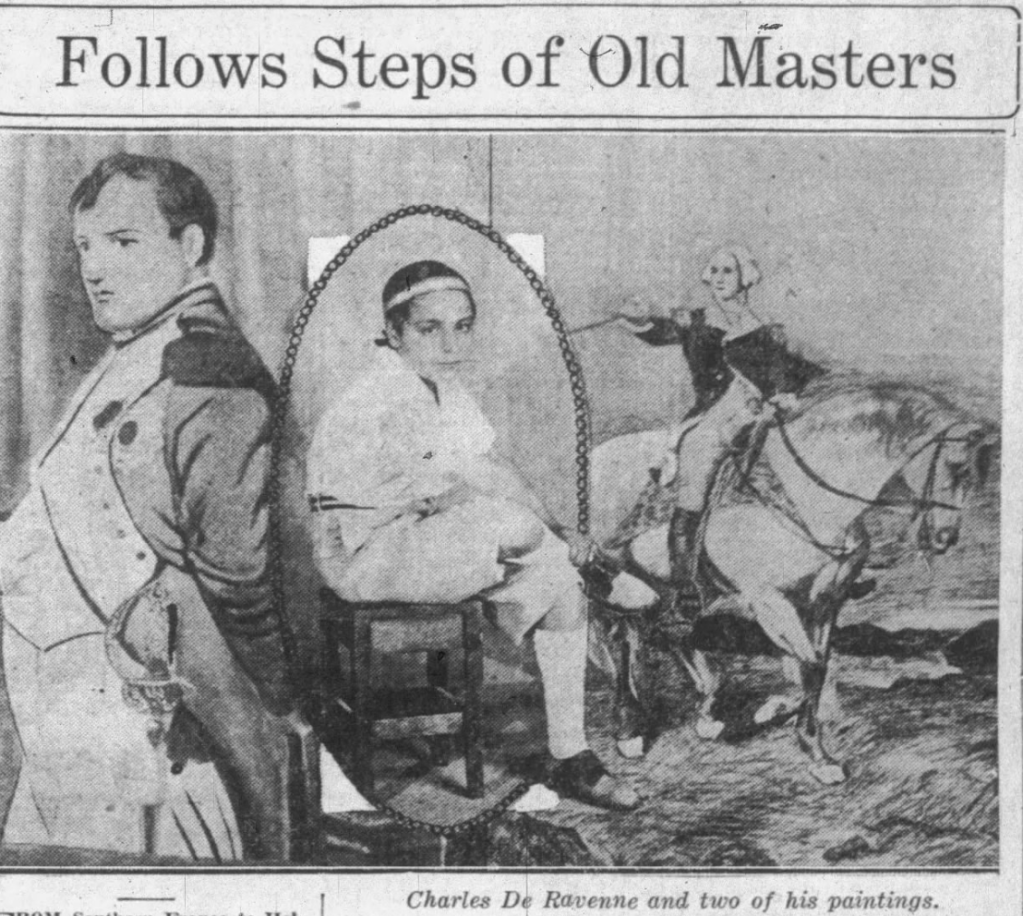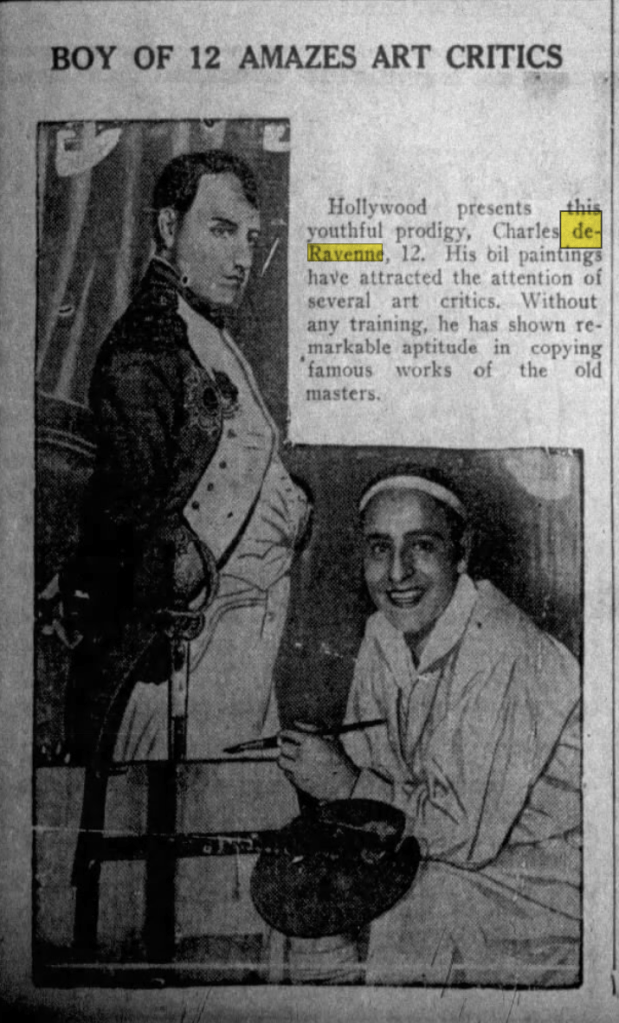 The young child, Charles de Ravenne (1911-1977) was perhaps the most notable of the children. Charles had a gift for painting and taught himself how to paint. At the age of 13, he started a famous painting called “Hollywood Comes to Napoleons Aid” depicting several celebrities dressed as soldiers helping Napoleon’s fight. Those celebrities included; Erick von Stroheim, Douglas Fairbanks, Adolphe Menjou, Sid Grauman, Marion Davies, William Powell, and Charlie Chaplin. Charles finished the painting by the age of 15 and it hung for a period time at the Roosevelt Hotel; art critics estimated the painting’s worth at $25,000. As a result, Paramount signed him for a character role in Evelyn Brent’s “Slightly Scarlet”. Charles was credited for 20 minor roles with the most notable in “Gentleman Prefer Blondes” and “Madame Bovery”.