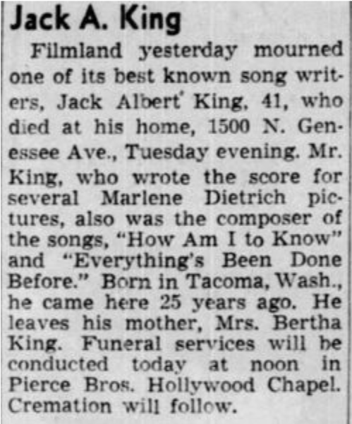 Musician Jack A King (1903-1943) resided at this property briefly in 1930 (he also resided at 6808 Whitley Terrace in 1930). King was a songwriter, composer, pianist, and singer during the 1920s and 1930s. Educated at the American Conservatory in Fontainebleau, France and in private music study with E. Enna, Gabrilovitsch, Camille Decreus, Bejamin Fabian, Ernest Schilling, and Isidore Philippe, King made his debut as a child concert pianist in 1910 and gave piano concerts until 1921. His European debut was in Berlin, and between 1921 and 1923 he was the assistant director of the University of California Glee Club. He was also a singing coach and appeared in vaudeville and night clubs. Joining ASCAP in 1935, his other popular-song compositions include “Any Time’s the Time to Fall in Love”, “Everything’s Been Done Before”, “I’m True to the Navy Now”, “You Still Belong to Me”, “Live and Love Today”, and “All I Know Is You’re in My Arms.” King also wrote the score for several Marlene Dietrich pictures.