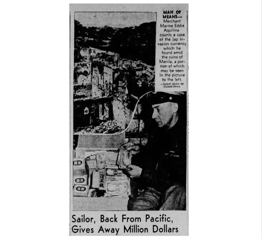 Between 1942 to 1946 movie stuntman Eddie Aquilina resided in the apartment. In May of 1945, Aquilina was a merchant seaman a veteran of WW1 and WW2, who recently returned on a boat carrying evacuees from a Japanese internment camp at Santo Tomas. Aquilina was at Pearl Harbor during WW2 and was actually nicked during the bombing. A former film stuntman, Aquilina found 150 million worth of Japanese currency which he unearthed from the Philippines National Bank in Manilla and upon his return to Los Angeles, gave away to friends, restaurant acquaintances, and on job interviews. However, his landlord Fred St. Clair would not accept the Japanese money for rent and moved to evict him from 6670 Milner Road in 1945. Aquilina fought the eviction stating that he lived on the property for five years and he returned home after six months in South Pacific and serviced with the eviction notice. Aquilina’s attorney indicated St. Clair did not follow proper eviction procedures when St. Clair admitted he wanted the entire property for himself due to ill-health. Aquilina won the eviction fight and was able to remain in the apartment eventually moving out a year later. During the court proceedings, he was handing out the Japanese money to anyone who would take it.