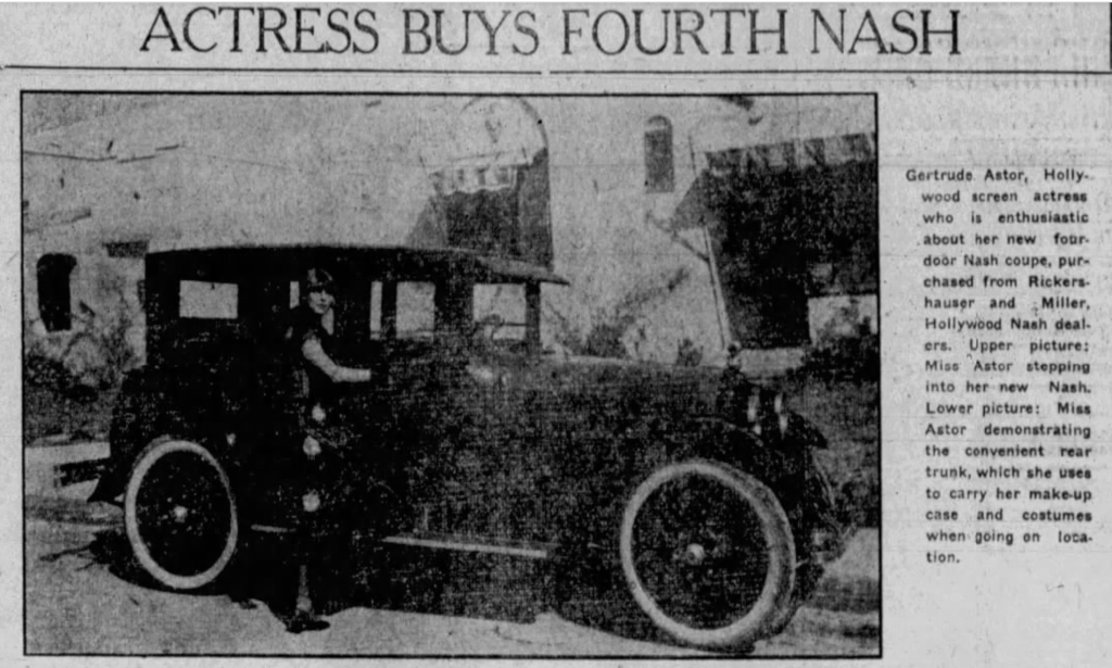 Between making movies, Astor found time to fix up the bungalow she had just bought. In July of 1925, Gertrude Astor was awarded third place for individuality and originality of design in the Southern California Bungalow annual national home survey of the American Architects Association. Her home is was described as “Spanish architecture with a touch to Italian to give a villa effect”. Gertrude was also known as the “Nash Girl” as she had purchased her forth Nash vehicle while she was living in Whitley Heights. In court, while she legally changed her last name from “Eyster” to “Astor” and informed the judge that she already owned several properties under the name “Gertrude Astor”. In March of 1926, she was building a home on Orange Grove Drive for $40,000 and in September of that same year, it was reported that she was building a 9 room Italian villa on Hacienda Drive. Below is Astor in front of the Whitley Heights home after it was reported that she purchased her forth Nash from Rickershauser & Miller, the Hollywood Nash Dealership.