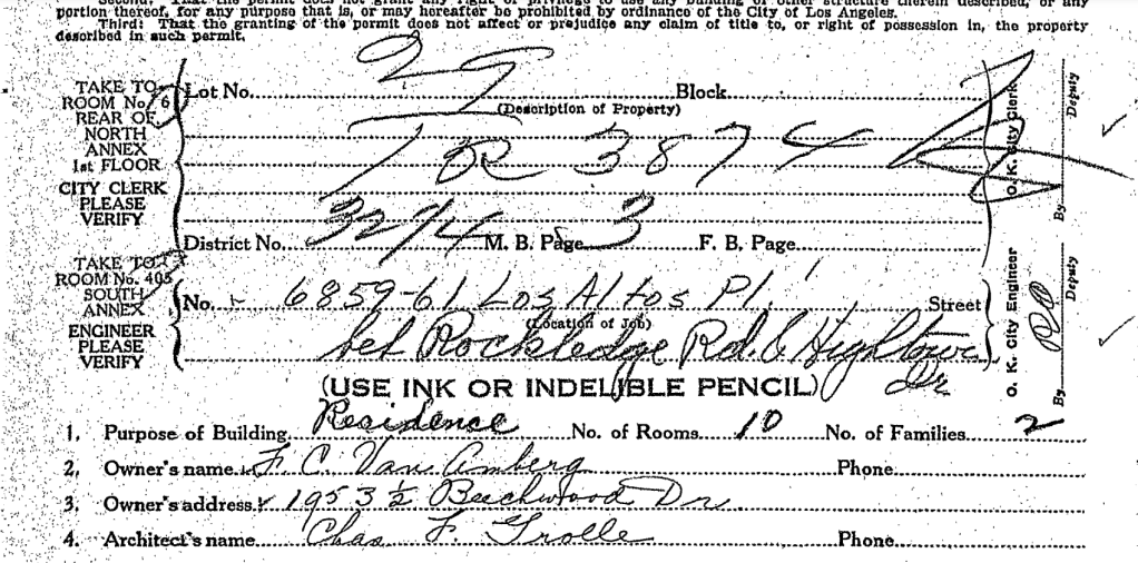 2012 Holly Hill Terrace was built by Helen C. Anderson who married electrician, Frank Van Amberg in 1922. According to the Southern California Architecture History website (https://socalarchhistory.blogspot.com/2014/08/tina-modotti-lloyd-wright-and-otto.html), the photo below is the Van Amberg residence located at 2012 Holly Hill Terrace with the Otto Bollman Residence in background, upper left, 2200 Broadview Terrace, 1921, which they obtained from “Gallagher’s Elevator,” Holly Leaves, April 18, 1924, p. 20-1. Upon further research, the photo below is not the Holly Hill Terrace house, but of another house that was built by the Van Amberg’s in the Hollywood Heights area. The Amberg’s remained in the Holly Hill Terrace home until until 1924 when they moved into an apartment on Beachwood Drive and then to 6883 Yeager Place while they were building a duplex (which is actually the home in the photo below) just below the Hightower Elevator located at 6859-6861 Los Altos Place.