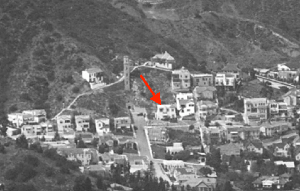 Below, Frank Van Amberg built the 10 room duplex in 1923 situated at 6851-6861 Los Altos Place, the first lot off of Hightower Drive, just below the Hightower Elevator. The Otto Bollman residence, located at 2200 Broadview Terrace can be seen directly above this residence to the right of the tower.