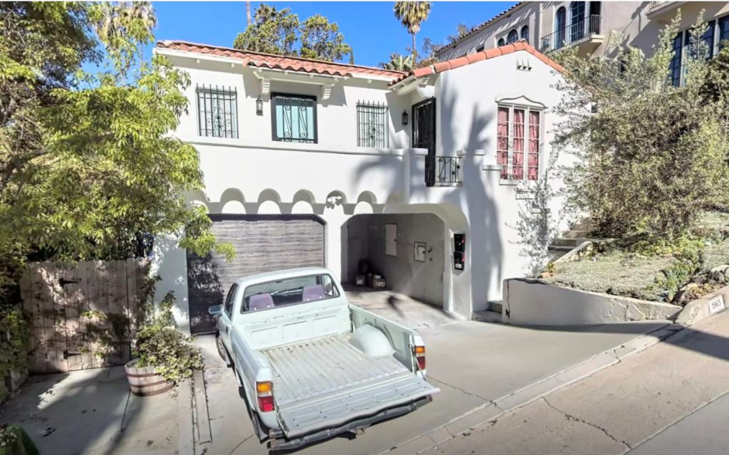 Taylor built 1965-1967 as a 10 room duplex consisting of a total of 1,825 square feet, each unit has two bedrooms and one bathroom and both entries are located above the garage on the second floor. Below, 1967 Whitley Avenue is the door on the left and 1965 Whitley Avenue is the door on the right. This duplex is designated as part of the Whitley Heights Historic District so much of its appearance has not been altered since it was built with its Spanish style roof, French windows and wooden balconette.