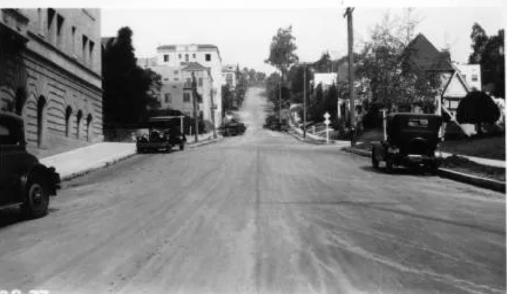 After George died, Lillian remained the apartment owner and continued to reside at 1965 Whitley Avenue until her death in 1962. In 1964, the duplex was put up for sale for $22,750 and sold immediately. It is unclear if the apartment building was sold prior to or after Lillian’s death. Now the two buildings still sit next to each other, but act as separate entities. Below is looking up Whitley Avenue from Franklin Avenue circa 1928. The Taylor Apartment building can be seen on the left side (last building).