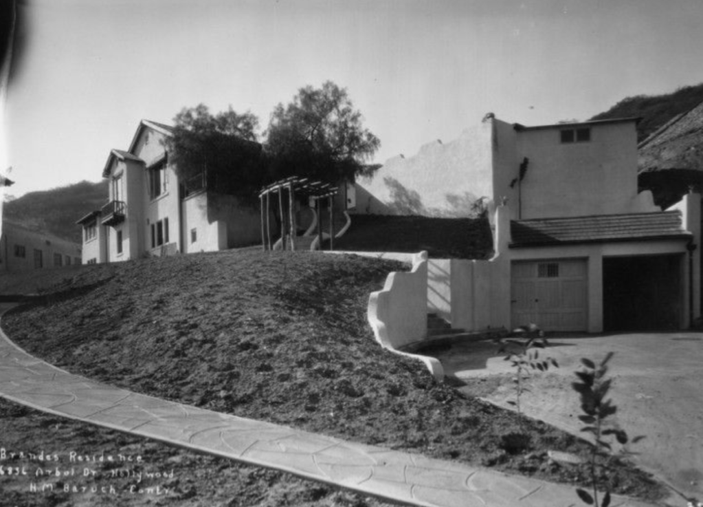 The first two homes to be built were on lots 7 and 8 by famed architect G. Albert Landsburgh who was well known for his work around the United States building theaters. Landsburgh built the Orpheum Theaters in Kansas City, San Francisco, Salt Lake City, and Los Angeles, the Warner Bros new theater in Hollywood, and the interior of the Shrine Auditorium. In 1924, screenwriter Madeline Brandeis, who wrote “The Children of All Lands” children’s’ book series, hired Landsburgh to build her a two-story, 15 room house on the last lot, lot 8, of Arbol Drive. Brandeis had recently divorced millionaire department store owner, E. John Brandeis. 24 year old Madeline was able to get a $400,000 settlement and sole custody of their daughter, Marie Madeline Brandeis, leaving her husband in his million dollar home in Beverly Hills. Below lot 8 is the larger house on the left and lot 7 is the smaller house on the right.