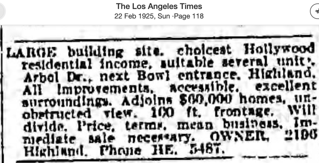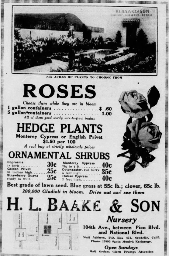 In 1912, a 40 year old rancher named Herman Baake and his wife, Anna, decided to buy a piece of land overlooking Los Angeles in Hollywood Park, situated on Highland Avenue near the Cahuenga Pass for $100.00. After building his 2 story bungalow home, Baake built the “Hollywood Avocado Nursery” which specialized in avocado pears. Seeing the value of his land, Herman and Anna subdivided the land into 12 lots and built a street called Arbol Drive in 1924. “Arbol ” means tree in Spanish and it is safe to say, Baake named the street to represent his nursery business. Baake and his son, Chester, decided to move the business to the Sawtelle area in Santa Monica after they divided up the land and they remained in their house which was located on the first two lots on Highland Avenue.