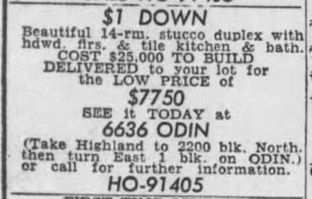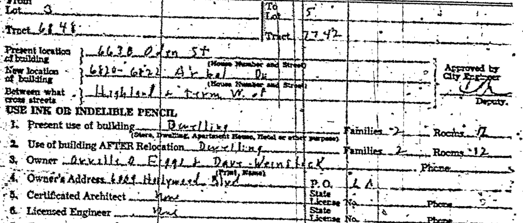 It appears lot 5 remained vacant until 1949 when Orville Figgs and Dave Weinstock bought a duplex located at 6638 Odin Street in Whitley Heights and saved it from being demolished for construction of the 101 Freeway and then put the duplex up for sale as income property. However, the new owners did not get much rental usage as the duplex was torn down in 1954.