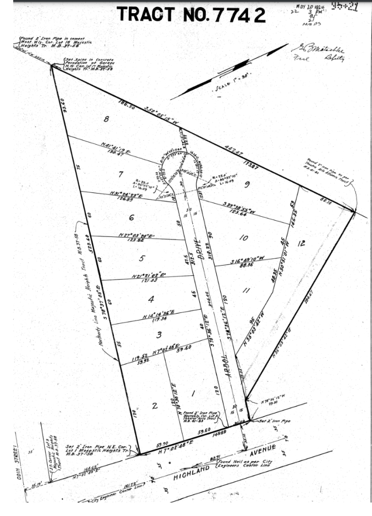 Lots 1 and 2 faced North Highland Avenue, Lots 3 through 8 were on the west side of Arbol Drive and finally, lots 9-12 were on the east side and were used only by the Hollywood Bowl. Lots 3-4 and 6-8 all had homes built between 1924 to 1928. Lot 5 had a relocated duplex moved over from Odin Street in Whitley Heights in 1949, only to be torn down by the Hollywood Bowl in 1954 to make way for another parking lot, along with the west side of Odin Street (Majestic Heights Tract).