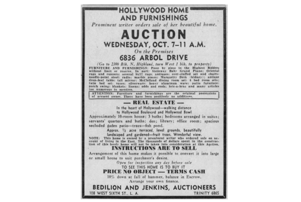 Madeline continued writing her children’s book series and even found love again. In 1933, Brandeis married Dr. Joseph Sampson in Yuma, Arizona and moved into her home on Arbol Drive. Dr. Sampson was the Chief of Pediatrics for the past six years at Sacramento Hospital and would be establishing an office down in Los Angeles. In 1936, Madeline decided to auction off her house and some of her belongings on Arbol Drive. According to the auction advertisement, 6836 Arbol Drive was approximately a 10 room house with the 3 bedrooms arranged in suites, each with their own bathroom. The house also included servants’ quarters and baths, a den, library, office, spacious secluded garden with a patio and a fish pond. The advertisement stated that she was living on the east coast at the time. Her husband had his practice in downtown Los Angeles and she was commuting back and forth to New York for work.