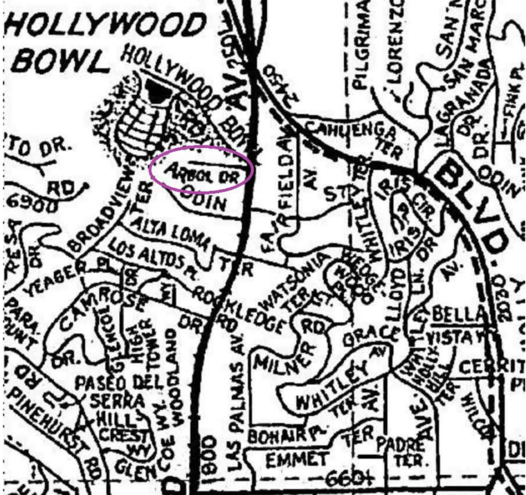 Like the 8000 block of Odin Street, Arbol Drive is no longer. The Hollywood Bowl took over tract 7742 and razed the street to be used as part of a parking lot on Highland Avenue. Below is where Arbol Drive would be located if the Hollywood Bowl did not demolished it for the parking lot.