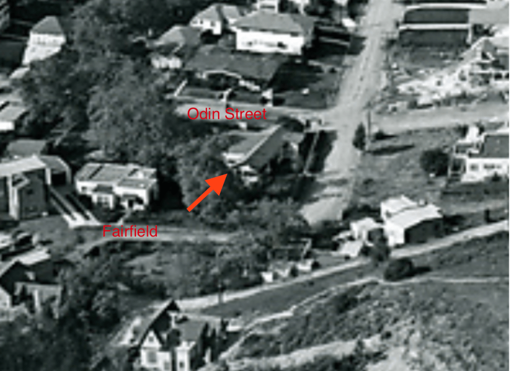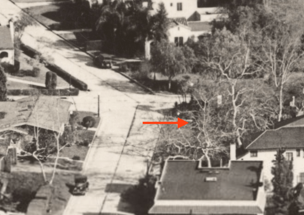 6662 Odin Street was built in 1916 by banker turned real estate broker Earl Dietz who built a 6 room bungalow on the northwest corner of Odin Street which intersected Fairfield Avenue at the time. Above, Fairfield Avenue (originally called Oakwood Avenue) started at Cahuenga Blvd., intersected through Odin Street, near Highland Avenue, curved after this house and then went back into Whitley Heights ending just below Whitley Terrace and Wedgewood Place. When Dietz and his family were not living at 6662 Odin Street, they were renting out the bungalow before they sold the house in 1924. In 1920, Dietz added another room to the house, now totaling three bedrooms and two bathrooms. In 1929, the new owner added a two-car detached garage to the property. Below is the corner of Odin Street and Fairfield Avenue seen from Broadview Terrace in Hollywood Heights.